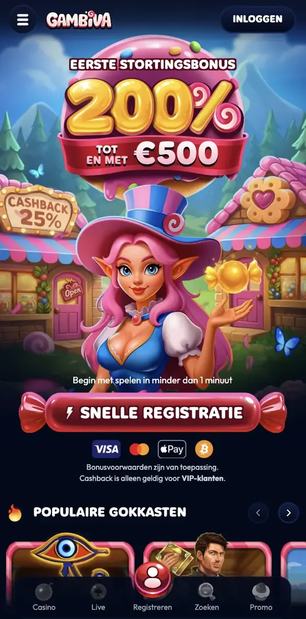 Onze mobiele lay-out is gemaakt voor kleinere schermen met overzichtelijke menu’s en grote aanraakvlakken. De lobby, kassa en promoties zijn gegroepeerd, zodat je ze met een paar tikken bereikt. Als je al een account hebt, werkt Gambiva inloggen op mobiel hetzelfde als op desktop, met één profiel op al je apparaten.